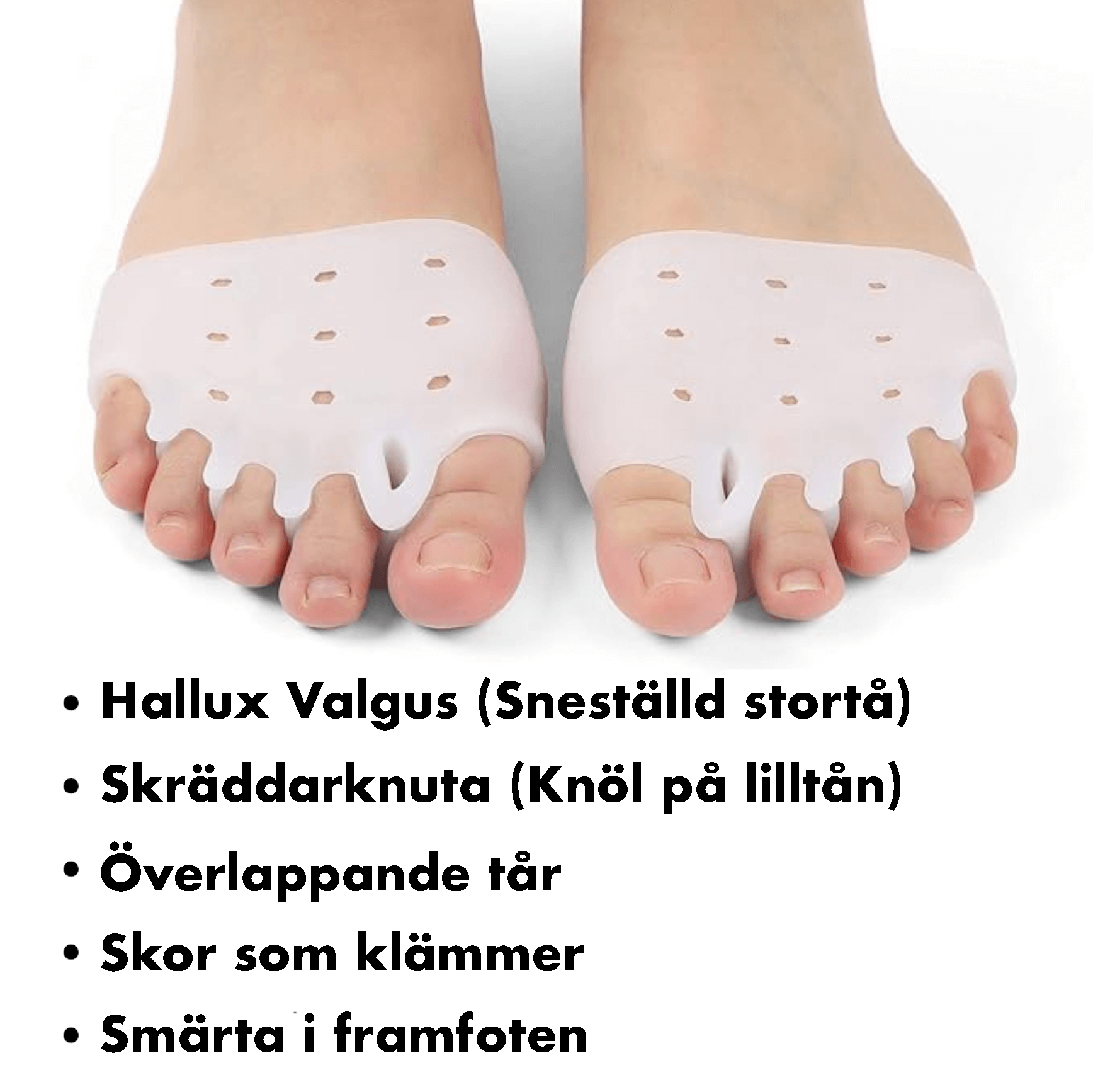 Dessa tåseparatörer är designade för att hantera olika fotproblem, inklusive hallux valgus (snedställd stortå), skräddarknuta (knöl på lilltån), överlappande tår, skor som klämmer och smärta i framfoten. Tillverkade av mjukt silikon, separerar de tårna skonsamt och erbjuder komfort under daglig användning. Deras smidiga design gör dem passande för alla typer av skor.