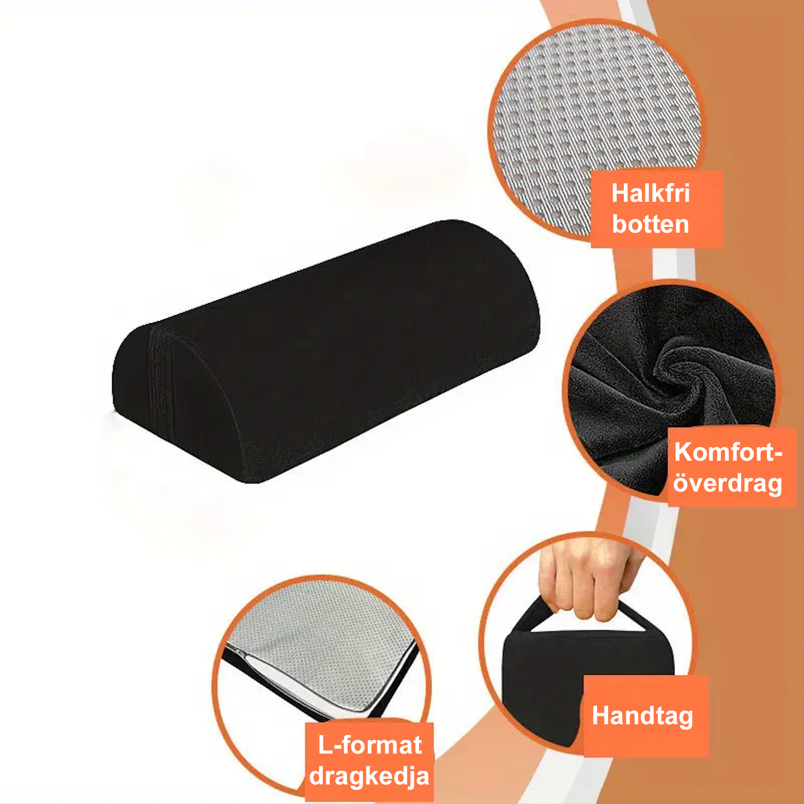 En mjuk och avlastande ergonomisk fotstödskudde i minnesskum som minskar tryck, förbättrar sittställningen och ger skön komfort vid längre stunder av sittande.