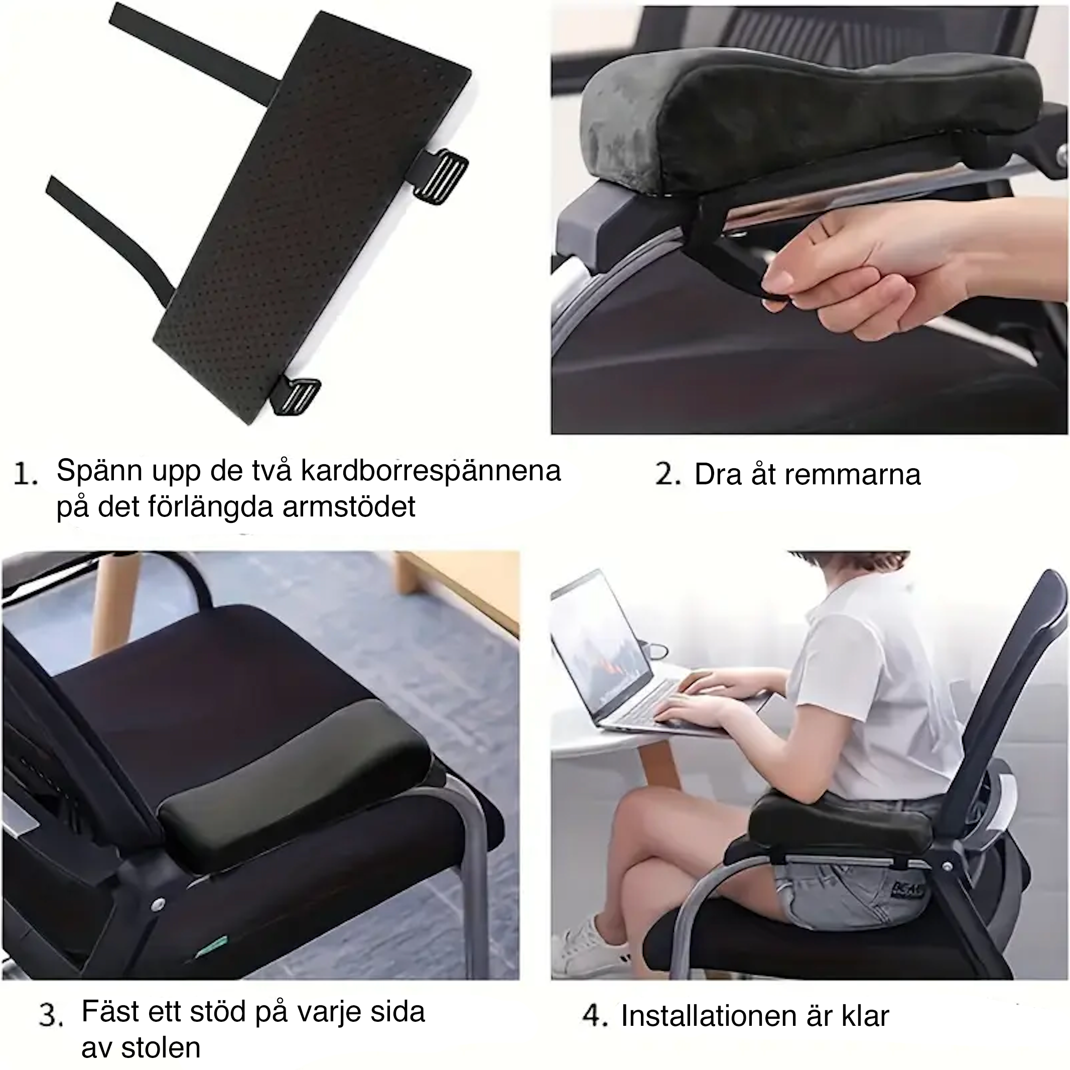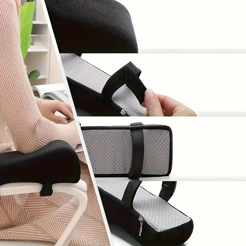 Ergonomiska armstödskuddar i mjukt minnesskum som ger stöd och avlastning vid lång tid framför datorn. Idealisk lösning för kontorsstol eller gamingstol för att minska tryck på armbågar och axlar och öka komforten vid skrivbordet. Levereras i 2-pack och monteras enkelt med remmar.