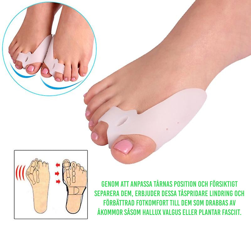 Minska obehag vid sned stortå med dessa silikon-tåseparerare. De är konstruerade för att behandla hallux valgus.